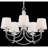 Хромированная металлическая арматура. Тканевые абажуры белого цвета. Декоративные стеклянные розетки. Источник света – лампа с цоколем E14.