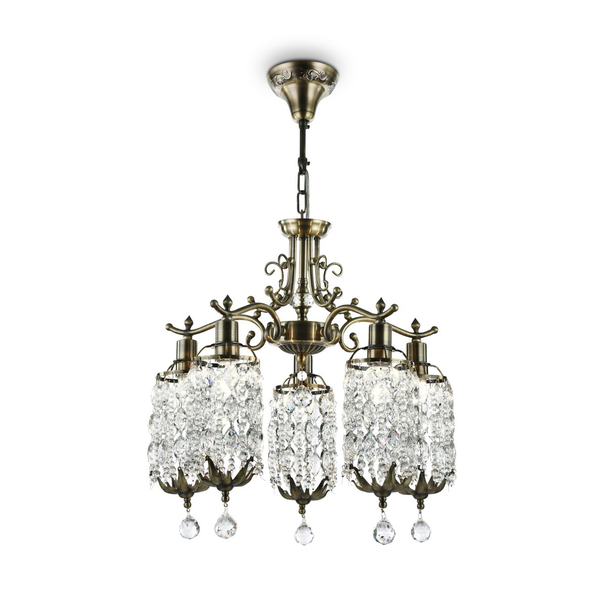 Металлическая арматура, цвет – бронза с патиной. Плафоны из прозрачных кристаллов. Декор – стеклянные подвески формы шара. Крепление 2 в 1 – монтаж люстры с цепью и без.