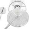 Простой каркас из никелированного металла образован сочетанием горизонтальных и вертикальных линий. Он украшает декоративные блюдца из прессованного стекла. Отдельного внимания в конструкции светильников заслуживают абажуры, сделанные из ткани на ПВХ. Они добавляют светильникам элегантности и тепла.