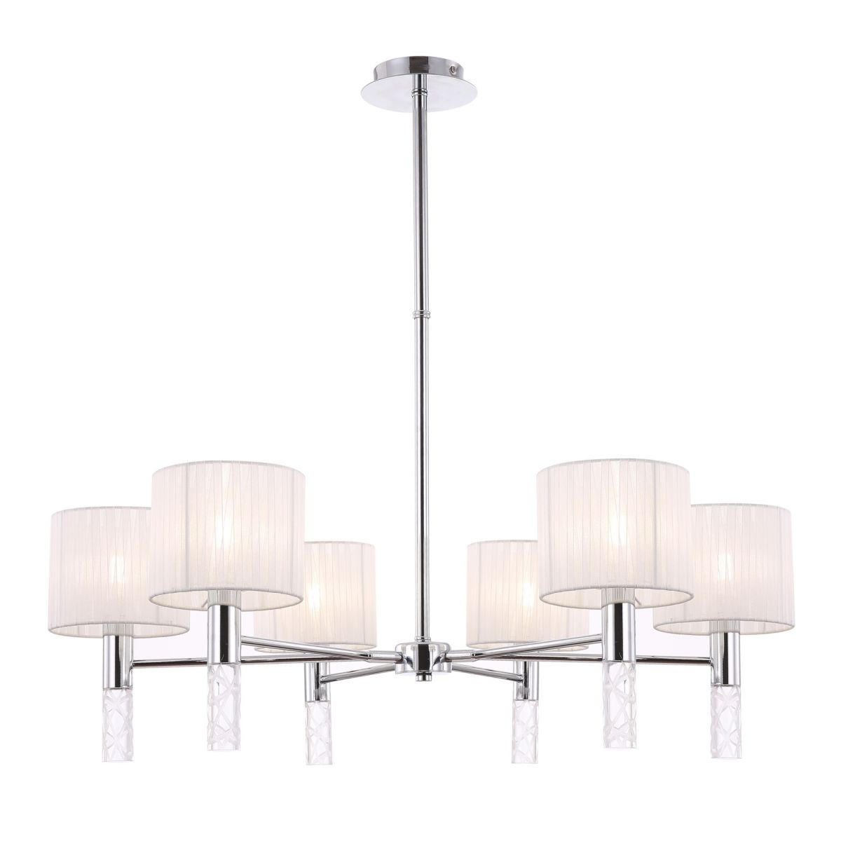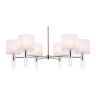 Светильники с абажурами из кремового текстиля и арматурой из хромированного металла. Основание плафонов декорировано цилиндрическими элементами из акрилового стекла, с нанесенным на них графическим орнаментом. Люстры трех размеров и бра подойдут для освещения гостиной квартиры или загородного дома, а также для гостиничных лобби и общественных пространств.