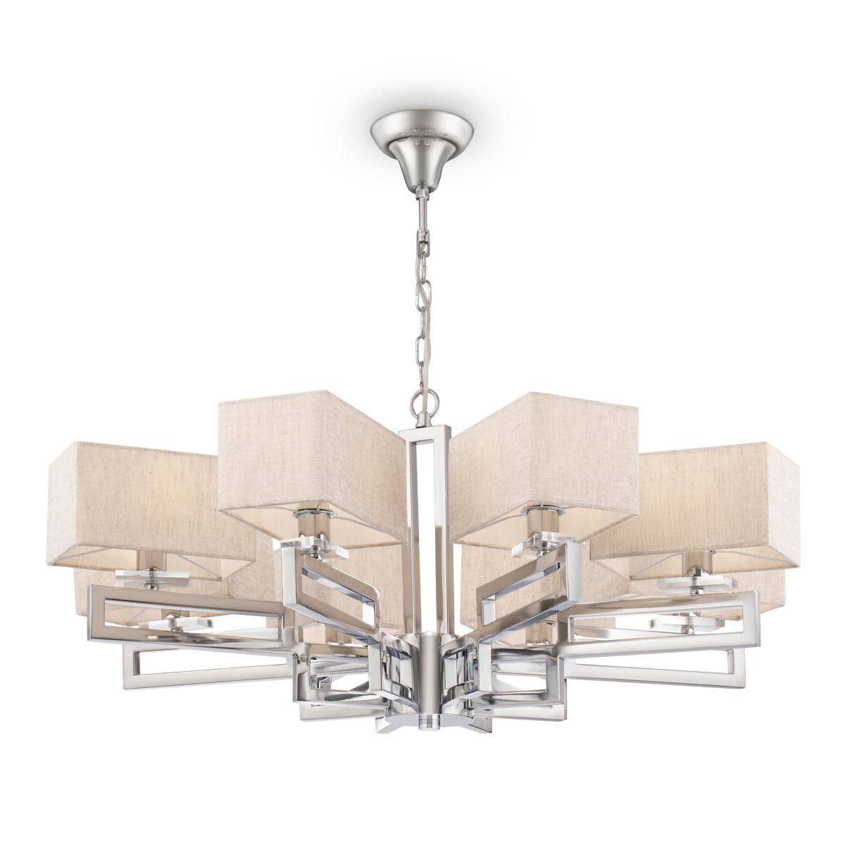 Строгие прямые линии в сочетании с хромированной арматурой из металла формируют строгий облик, который смягчает натуральная текстура абажуров из хлопка на ПВХ. В качестве дополнительного декора служат пластины из прозрачного стекла. Высота люстр регулируется длиной цепи.