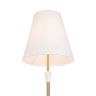 Металлическая арматура в цвете латунь. Дополнительные элементы — минималистичные вставки из натурального белого мрамора. Белые абажуры из ткани в форме конуса. Источник света — лампа с цоколем Е14 или Е27.