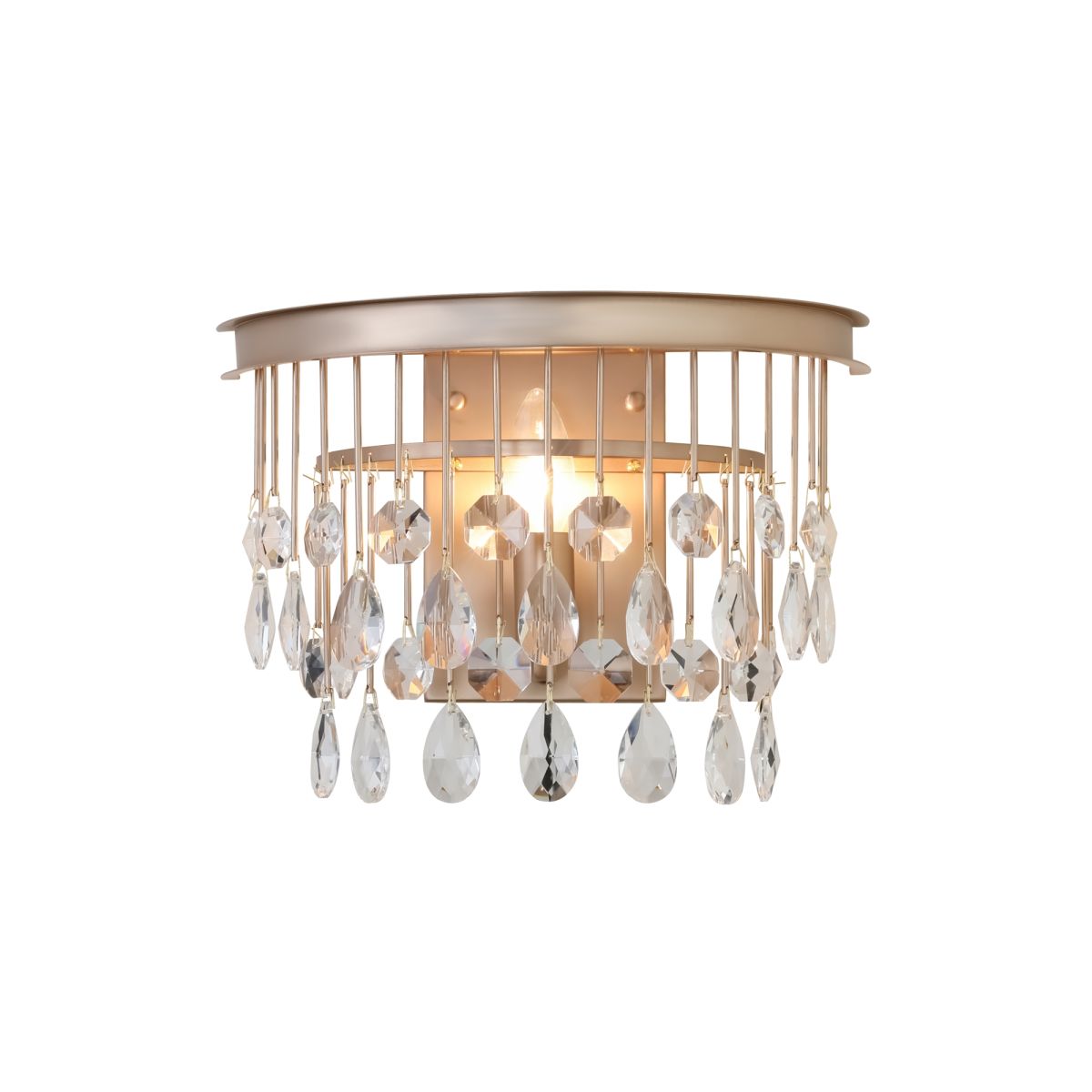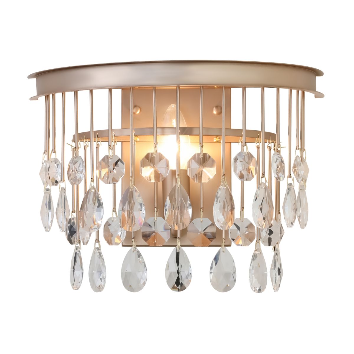 Материал арматуры – металл, оттенки – золото и хром. Комбинация металла и хрусталя в декоре. Металлические трубки гальванизированы в тон арматуре. Хрустальные подвески обрамляют композицию. Высота люстр регулируется с помощью цепи. Цоколь Е14.