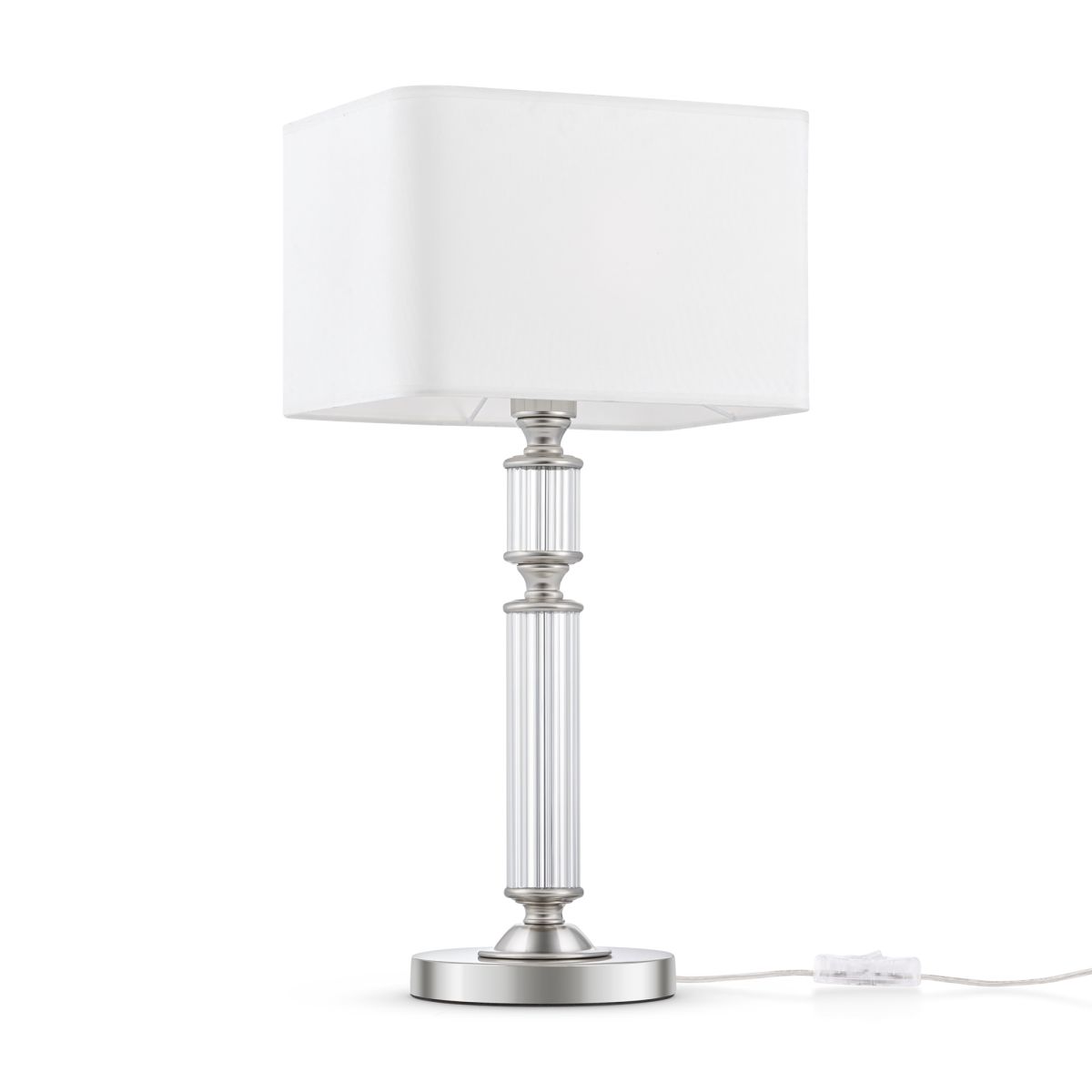 Хромированная металлическая арматура. Абажуры из белого текстиля, нанесенного на ПВХ. Стеклянный декор центральной части и розеток. Геометрические рожки.