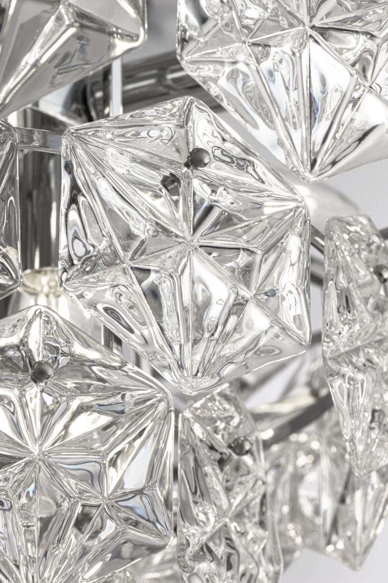 Хромированная металлическая арматура. Декор – прозрачное стекло в форме шестигранника. Крупные грани красиво преломляют свет. Регулируемая высота. Источник света – лампа с цоколем Е14.