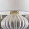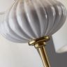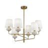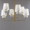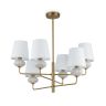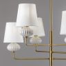 Металлическая арматура, цвет - латунь. Керамические декоративные элементы. Матовые белые абажуры. Силуэт светильника вытягивает интерьер. Источник света — лампа. Цоколь E14.