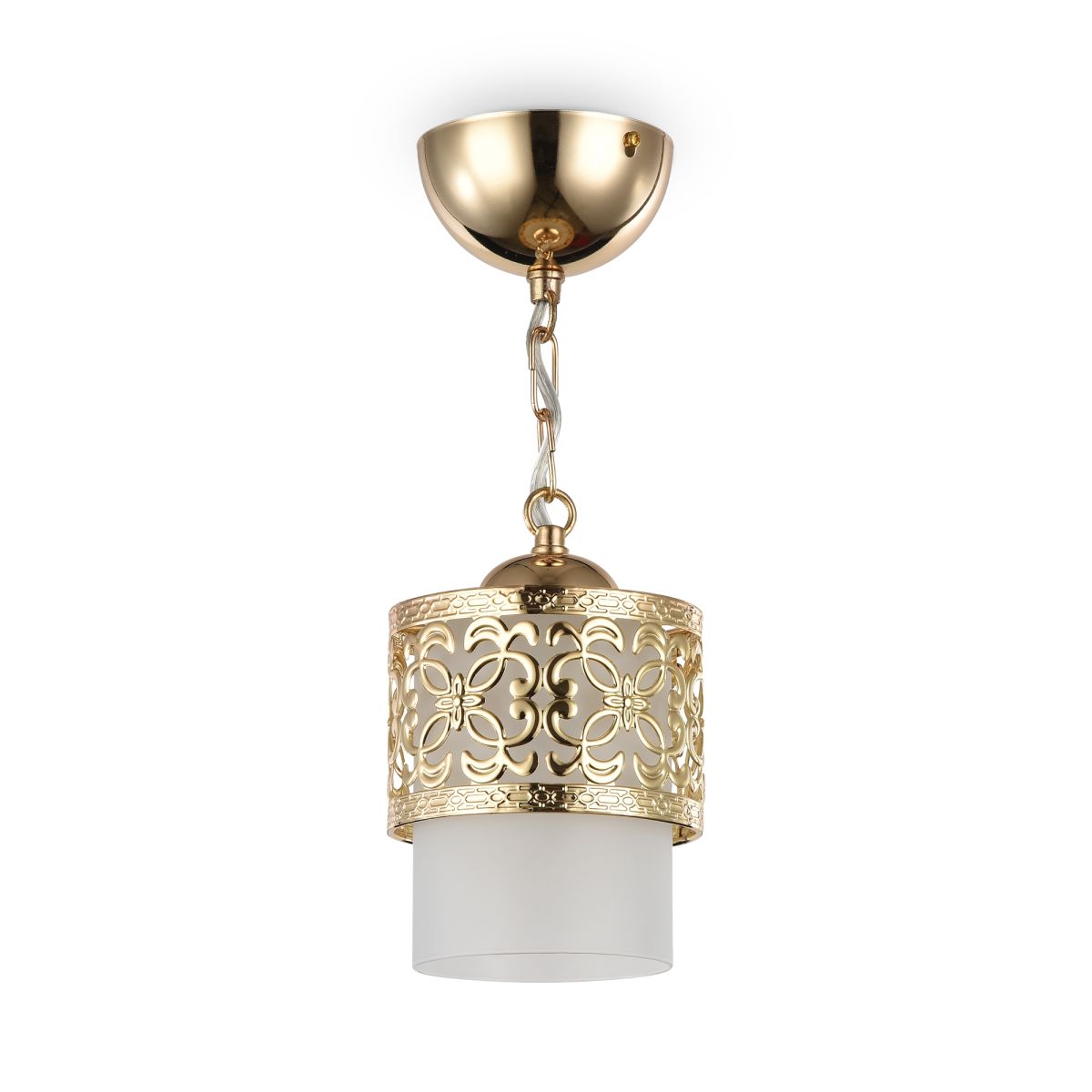 Подвес имеет два плафона: плафон из матового стекла и декоративный металлический плафон с ажурным узором и фигурной чеканкой на ободке. Цвета арматуры и металлического декоративного плафона - французское золото, античная бронза и белый с золотистым патинированием.