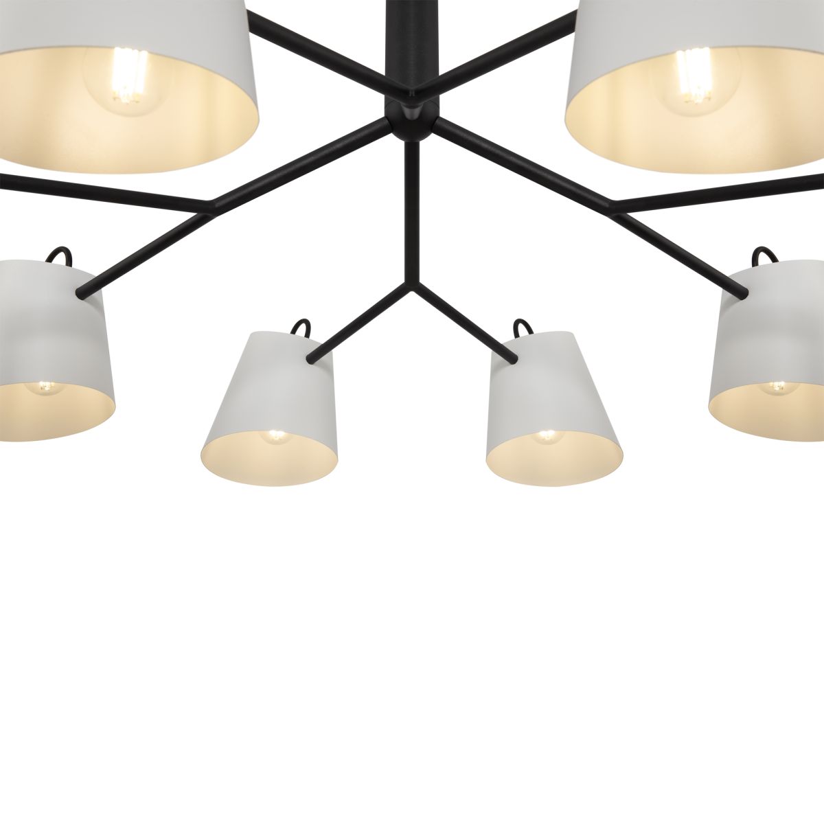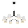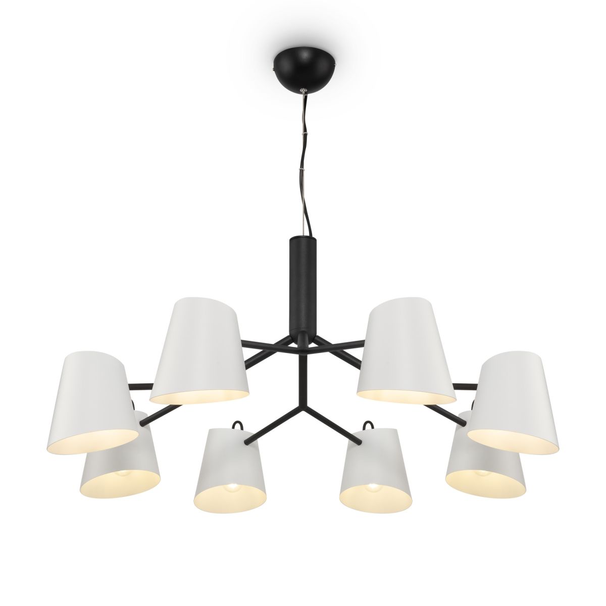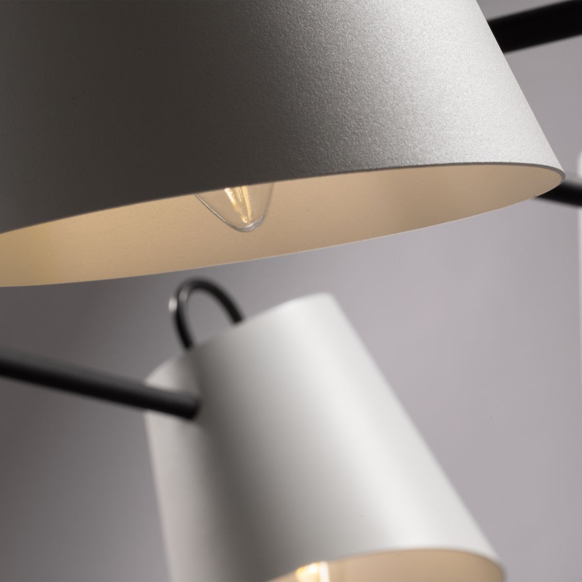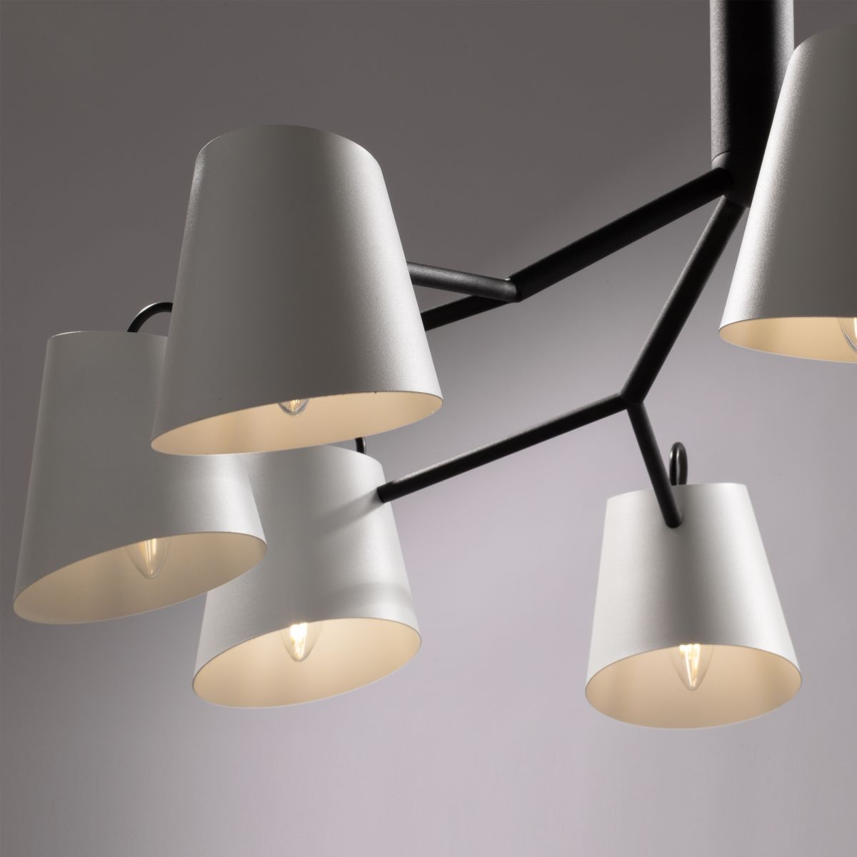 Арматура и плафоны выполнены из металла. Цвет арматуры – черный. Плафоны белого оттенка. Оригинальная форма плафонов с косым срезом. Источник света – лампа с цоколем E14.