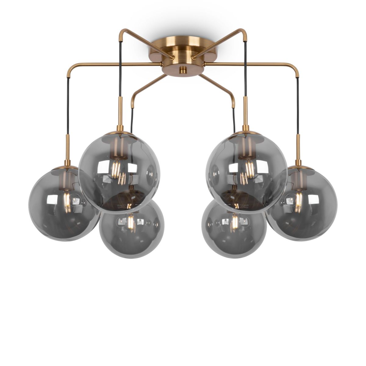 Металлическая арматура. Цвет – матовый черный с золотом. Плафоны-сферы из глянцевого стекла дымчатого оттенка. Широкий ассортимент для комплексного освещения. Источник света – лампа с цоколем E27.