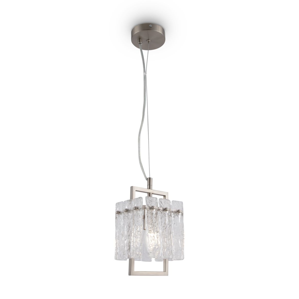 Металлическая арматура. Оттенки – латунь, никель. Декор – фактурные прямоугольные пластины. Материал декора – стекло. Подвесные светильники можно размещать на ножке и устанавливать как потолочный свет. Источник света – лампа с цоколем Е14.