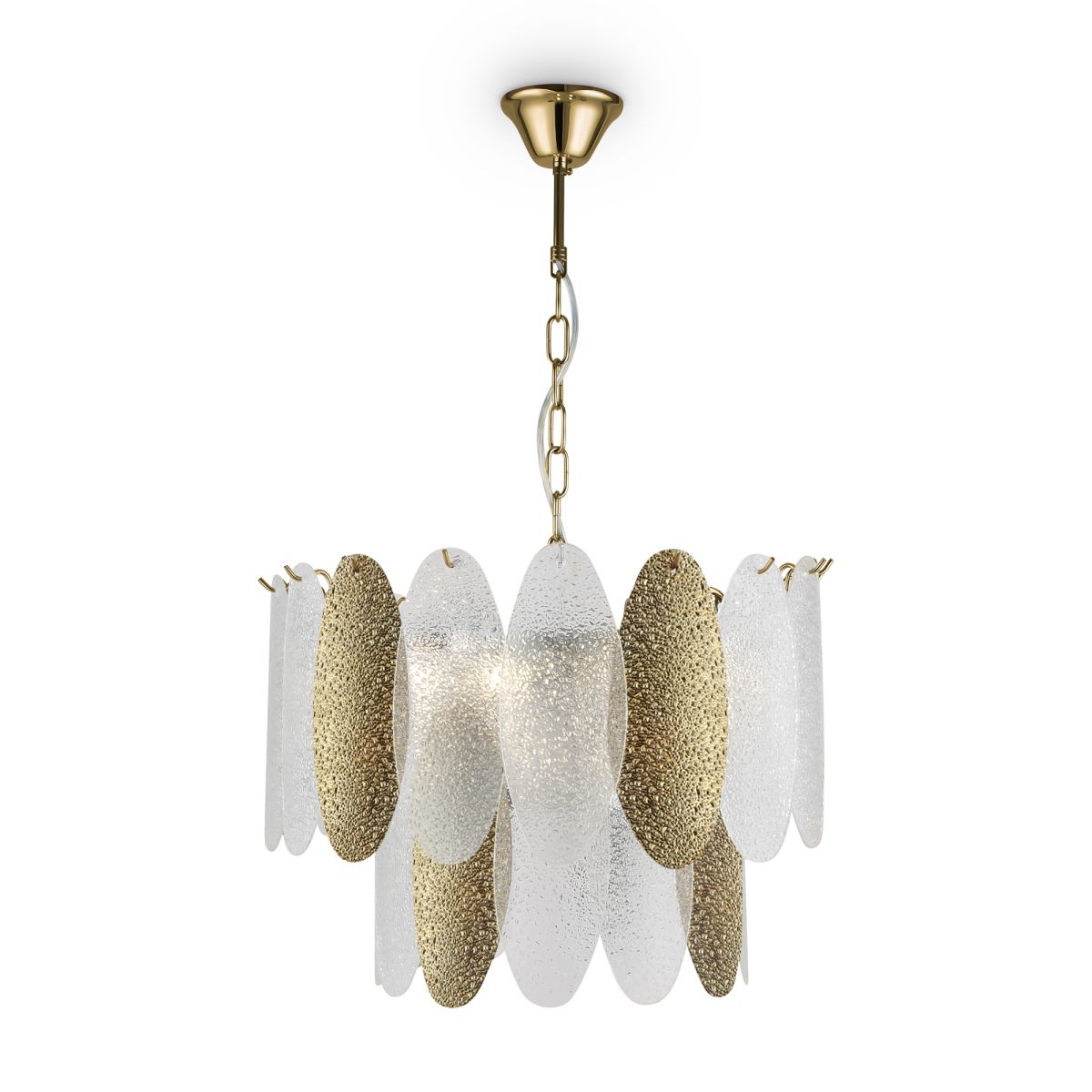Материал арматуры – металл. Оттенки – золото, хром. Трендовый декор в виде фактурных вытянутых пластин из стекла. Часть пластин окрашена в тон арматуре, часть – прозрачная. Источник света – лампа с цоколем Е14.