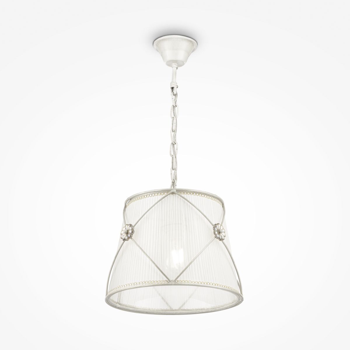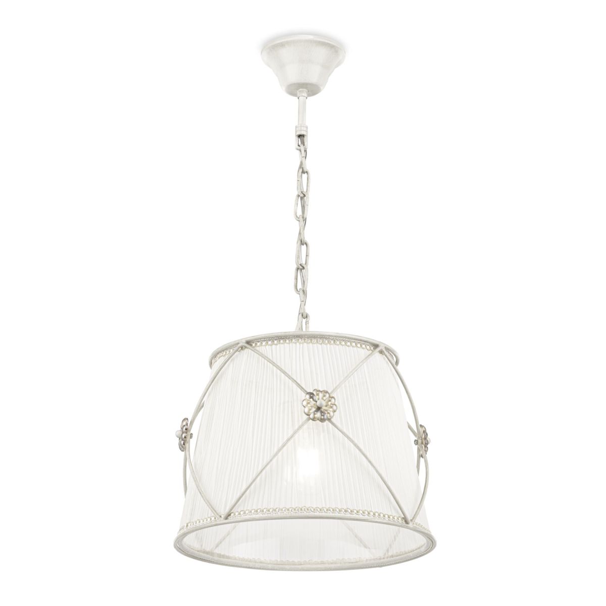 Арматура из металла в жемчужно-белом цвете. Кремовый абажур из плиссиро ванной органзы, окантовка золотистой тесьмой. Абажур заключен в металличе ский каркас. Флористический декор.