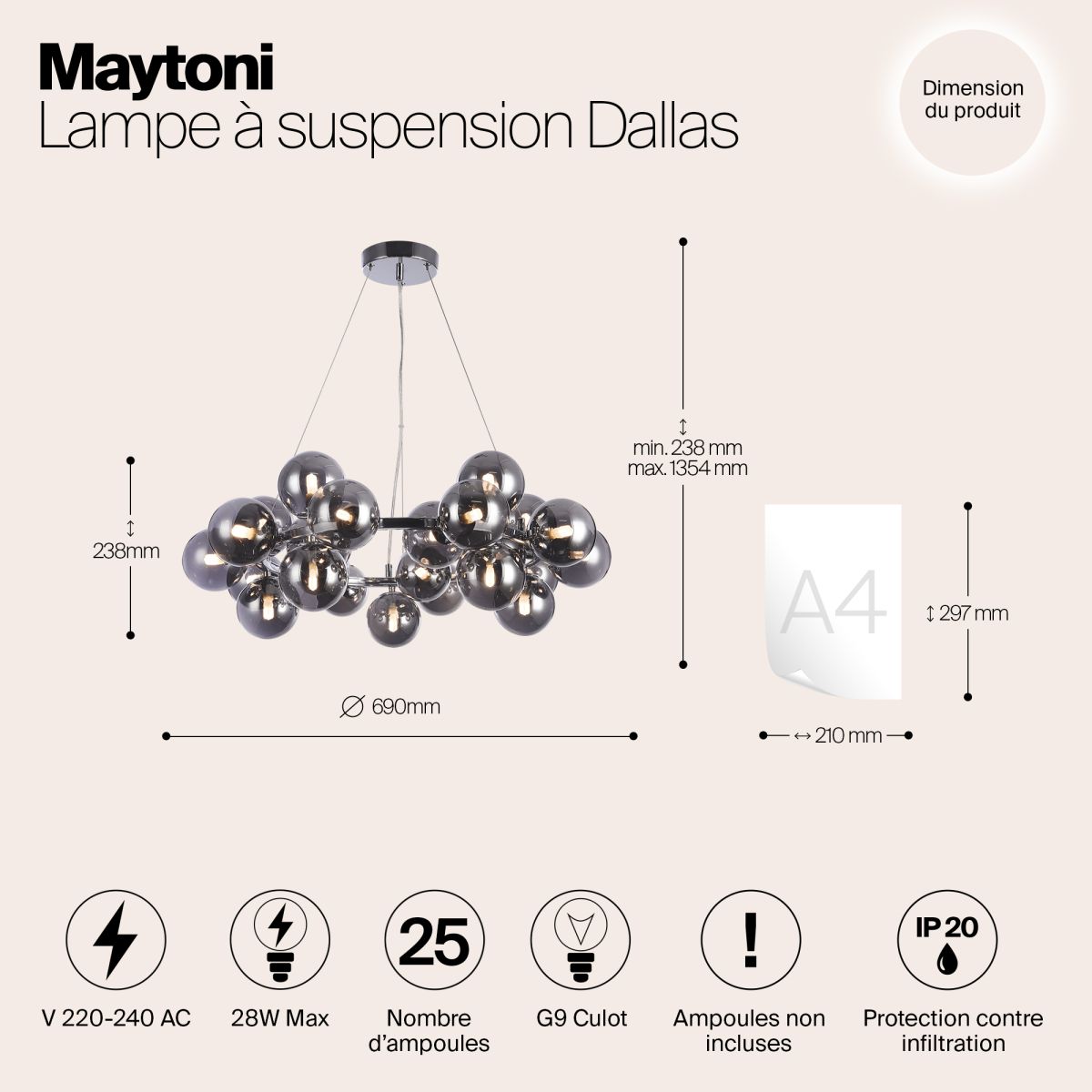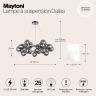 Металлическая арматура в четырех цветах: матовый черный, хром, золото, латунь. Плафоны — выдувное стекло. Цвета — дымчатый, янтарный, коньячный. Дизайн с имитацией молекулярной структуры. Высота подвесных светильников регулируется тросом. Лампа с цоколем G9.