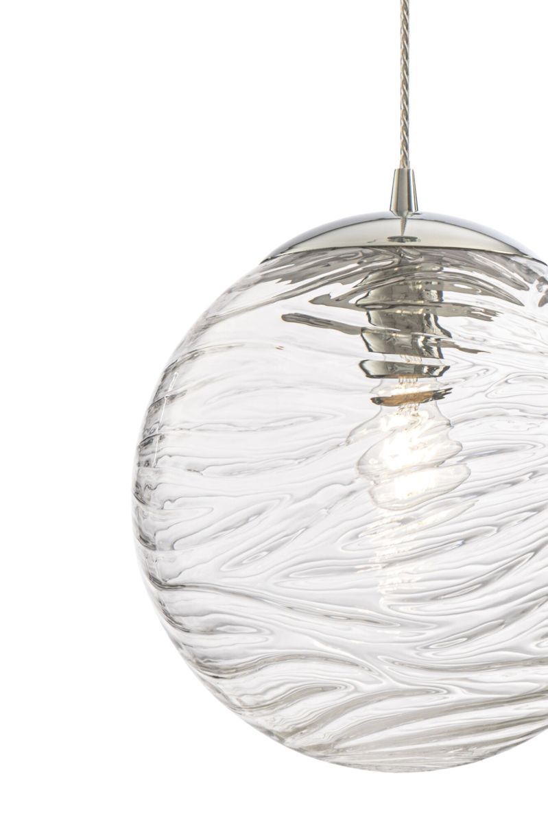 Волнистые мягкие линии на поверхности стеклянных плафонов напоминают песочные барханы, перетекающие один в другой по бескрайним просторам пустыни. Благодаря такой фактуре образ заключенной внутри лампы размывается, а свет становится рассеянным и буквально обволакивает освещаемое пространство. Плафоны представлены в дымчатом, прозрачном и янтарном цвете. Высоту светильников можно отрегулировать, изменяя длину шнура.