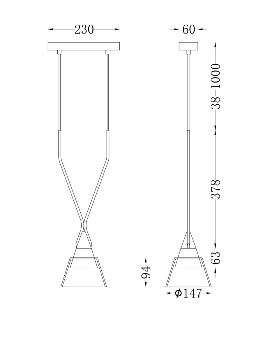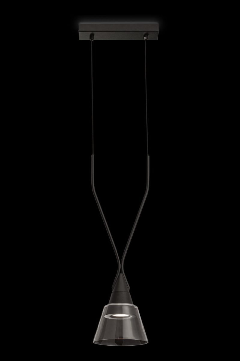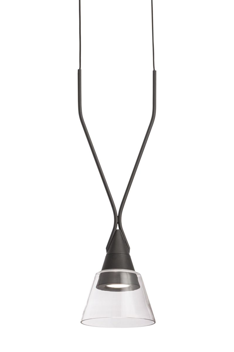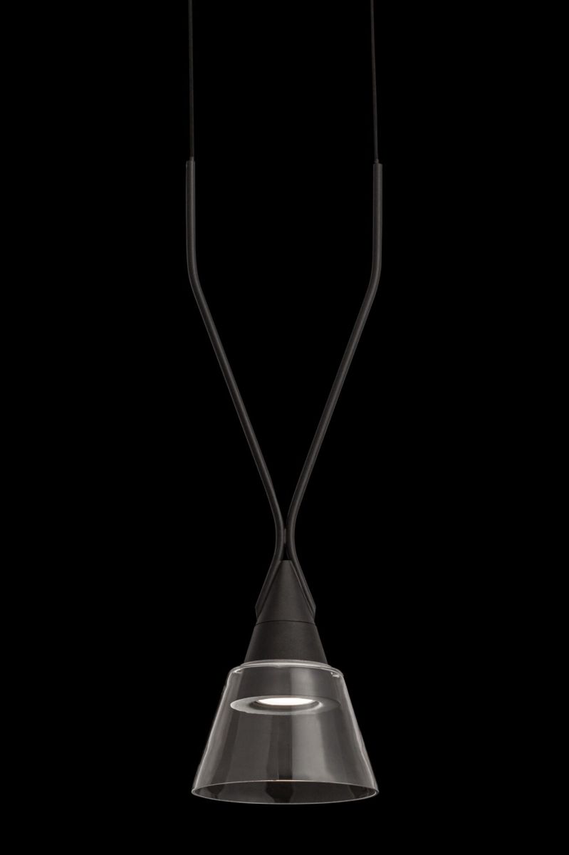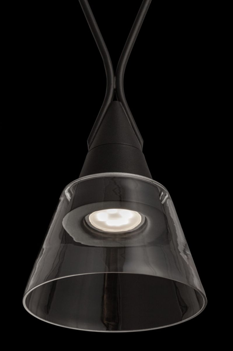 Сбалансированный и утонченный дизайн светильников основан на контрасте легкого прозрачного плафона из стекла и металлического корпуса, выкрашенного в черный цвет. Являясь полной противоположностью, детали светильника будто вытекают одна из другой. Лампа утоплена вглубь корпуса, что обеспечивает зрительный комфорт. Высота светильников регулируется длиной шнура.