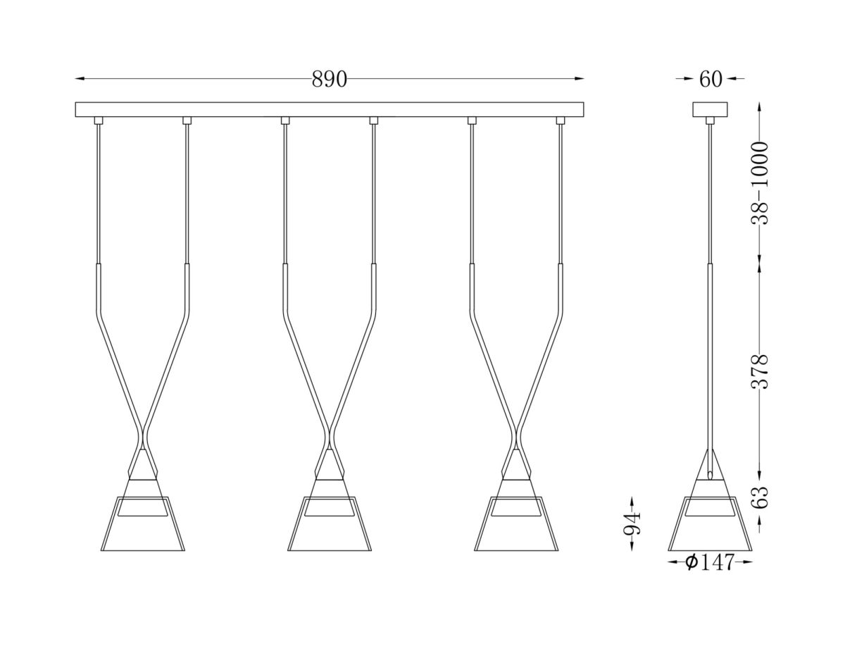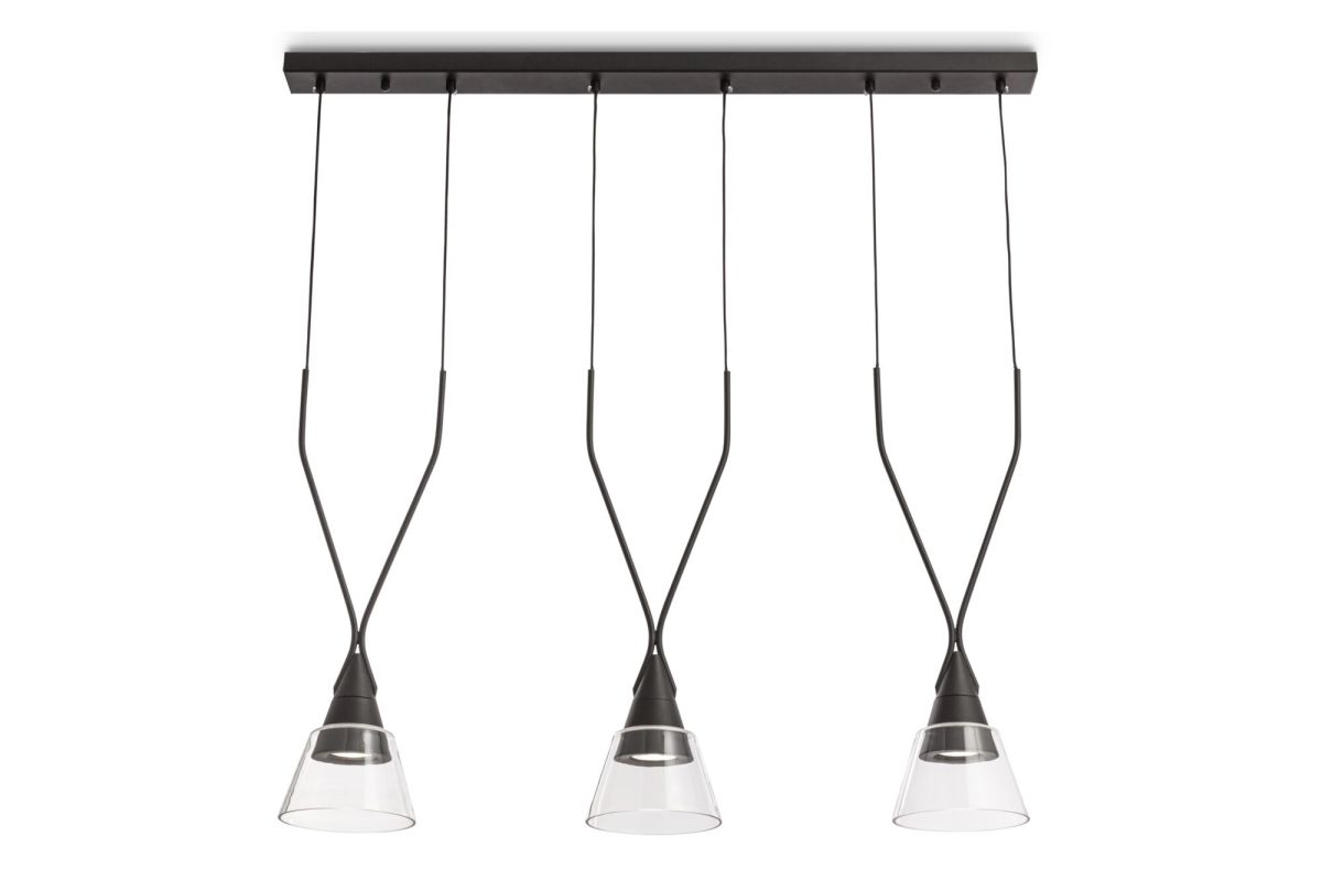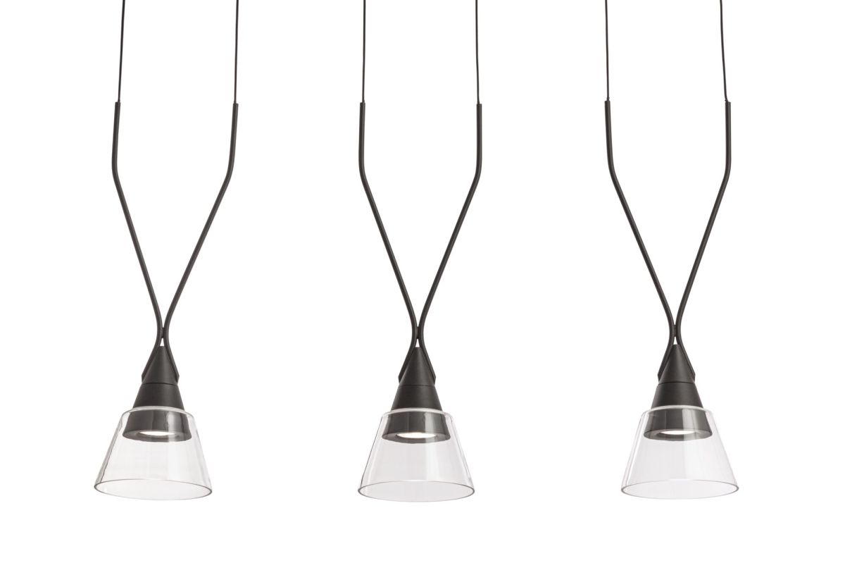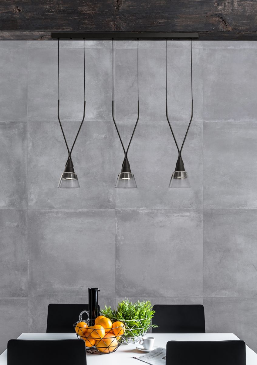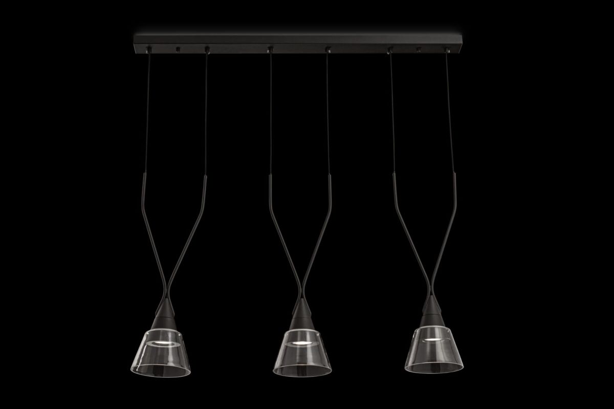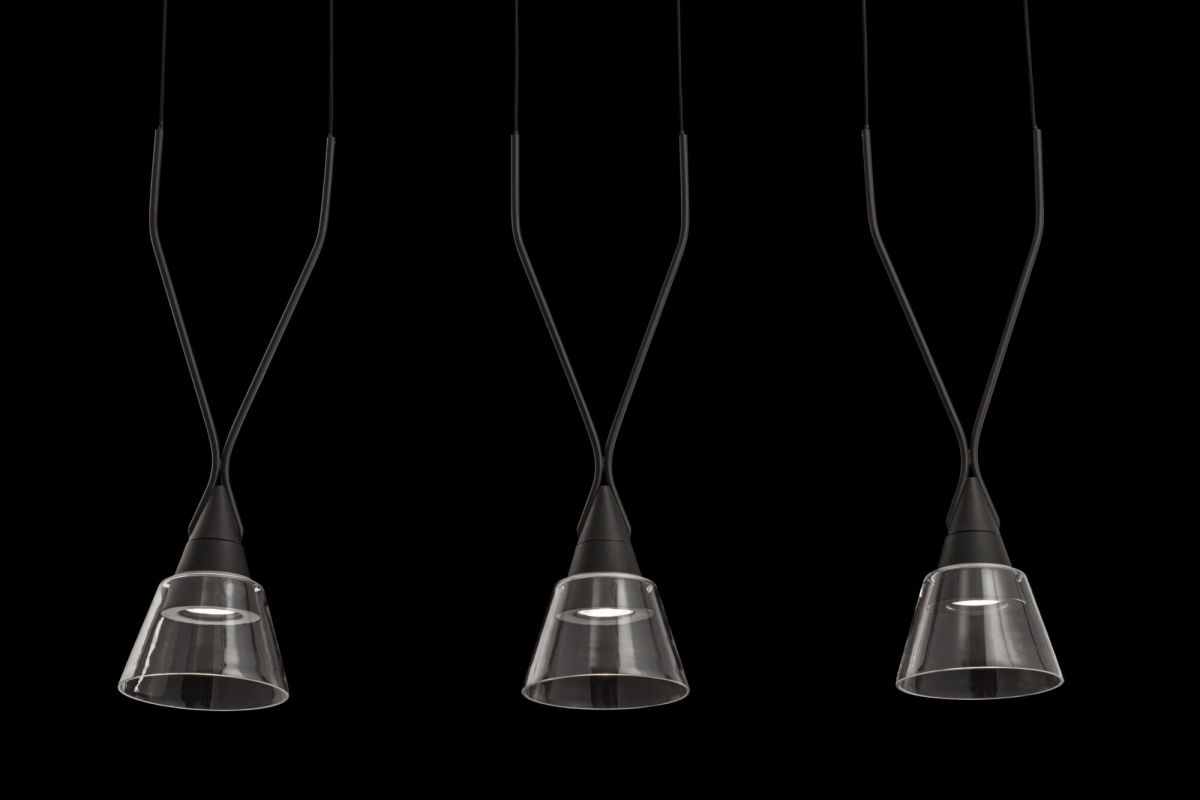 Сбалансированный и утонченный дизайн светильников основан на контрасте легкого прозрачного плафона из стекла и металлического корпуса, выкрашенного в черный цвет. Являясь полной противоположностью, детали светильника будто вытекают одна из другой. Лампа утоплена вглубь корпуса, что обеспечивает зрительный комфорт. Высота светильников регулируется длиной шнура.