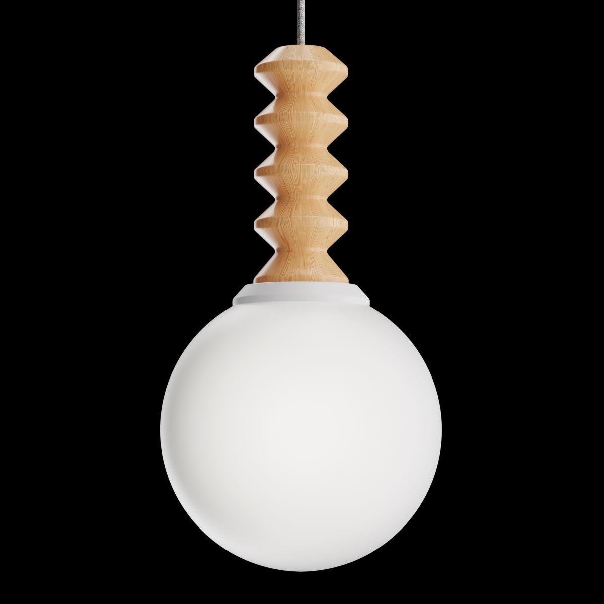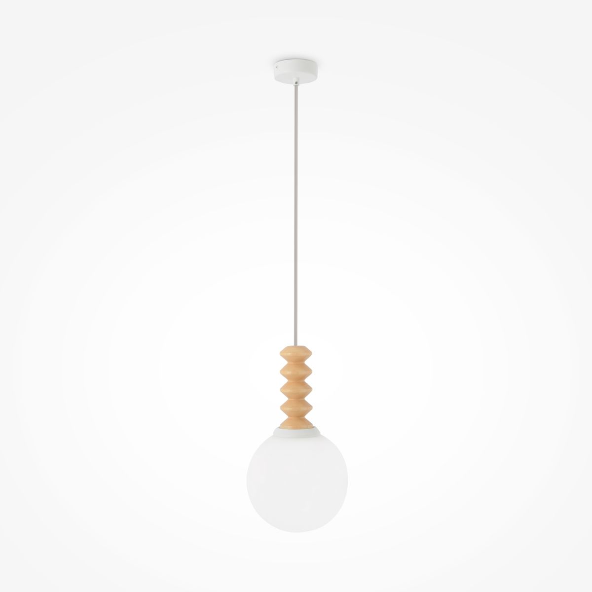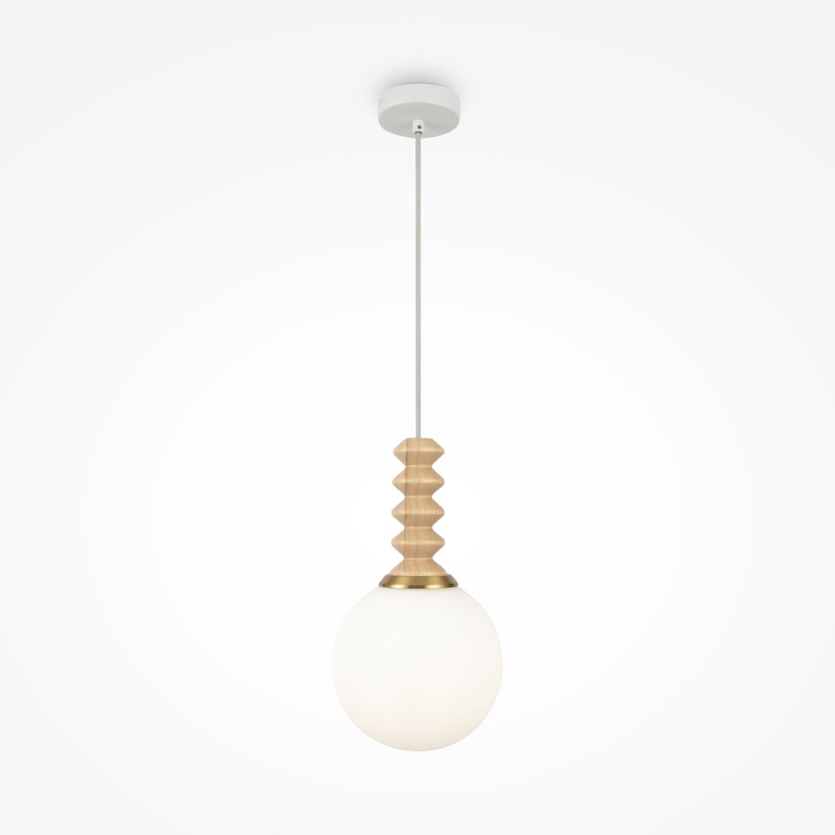 Металлическая арматура в бежевом цвете. Плафон – матовое белое стекло. Оригинальный фигурный декор из натурального дерева. Трендовый дизайн в скандинавском стиле.