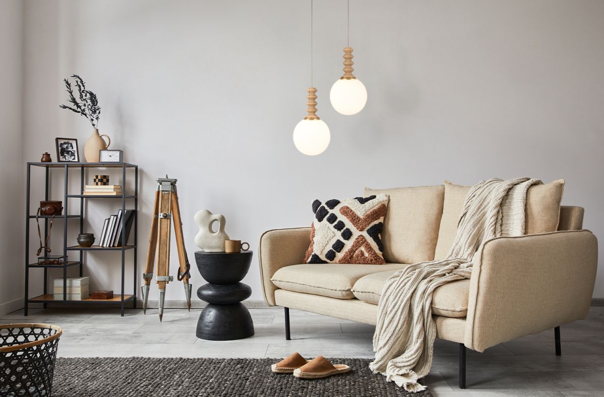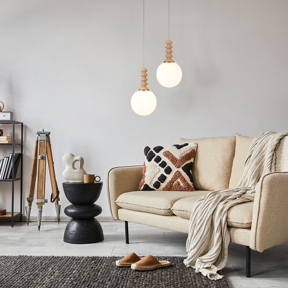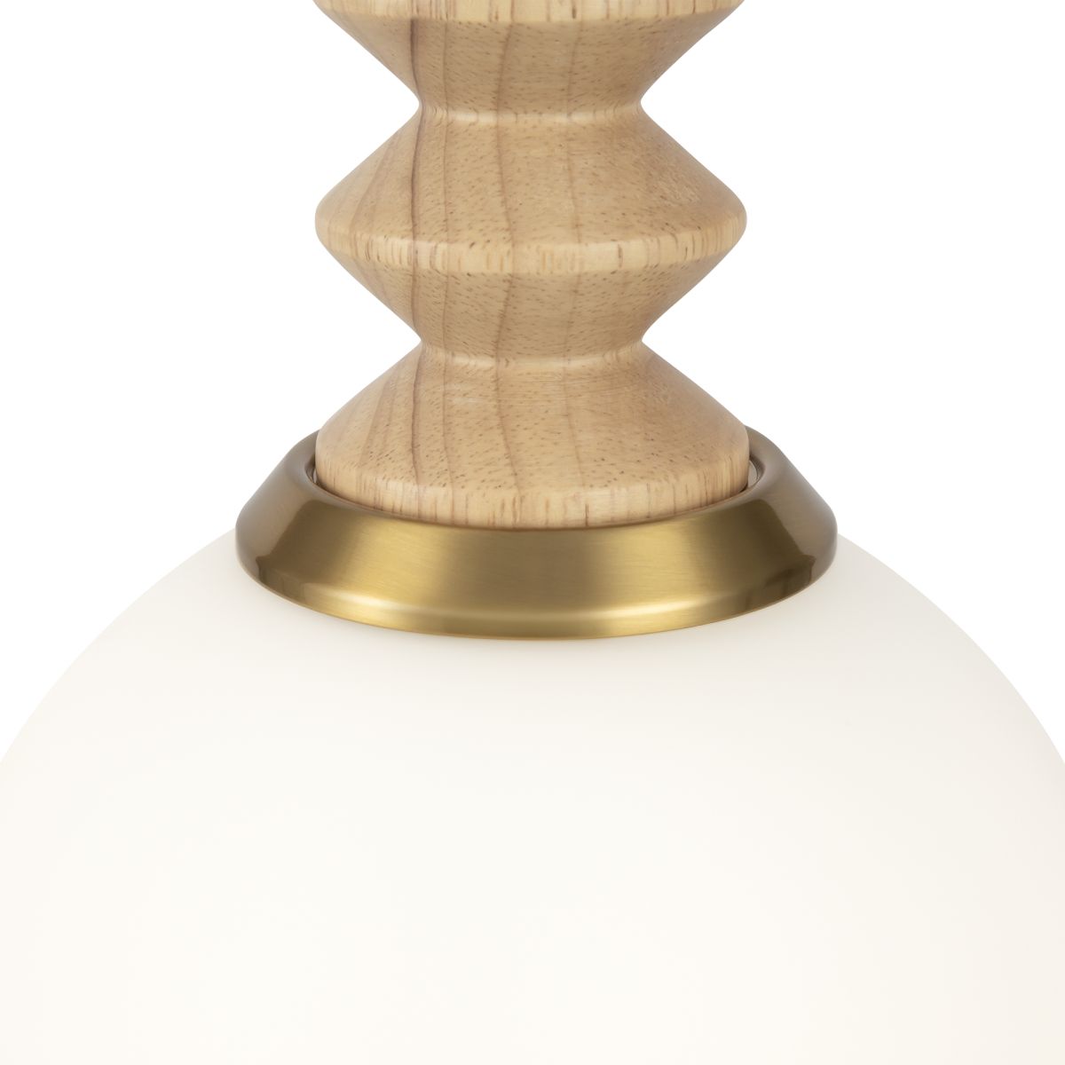 Металлическая арматура в бежевом цвете. Плафон – матовое белое стекло. Оригинальный фигурный декор из натурального дерева. Трендовый дизайн в скандинавском стиле.