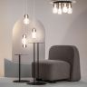 Материал арматуры - металл, цвета - золото, хром. Микс плафонов: гладкие cферы коньячного или дымчатого оттенка + округлые рельефные с ромбовидным узором из прозрачного стекла. Регулируемая высота подвесных моделей - максимальная длина провода 3 метра. LED-источник света, цветовая температура 3000К